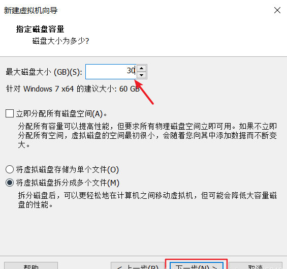9、分配磁盘的话,建议win7 32位系统在20G以上,win7 64位系统在30G以上,当然这个后期是可以增大的,但不能减小,所以建议不要分配太大,我这里64位30G。