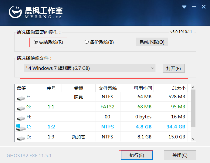 7、 打开晨枫一键装机,选择【安装系统】,点击【打开】找到之前下载好的镜像系统,然后点击【执行】。(安装路径一般默认位C盘,不需要重新勾选)
