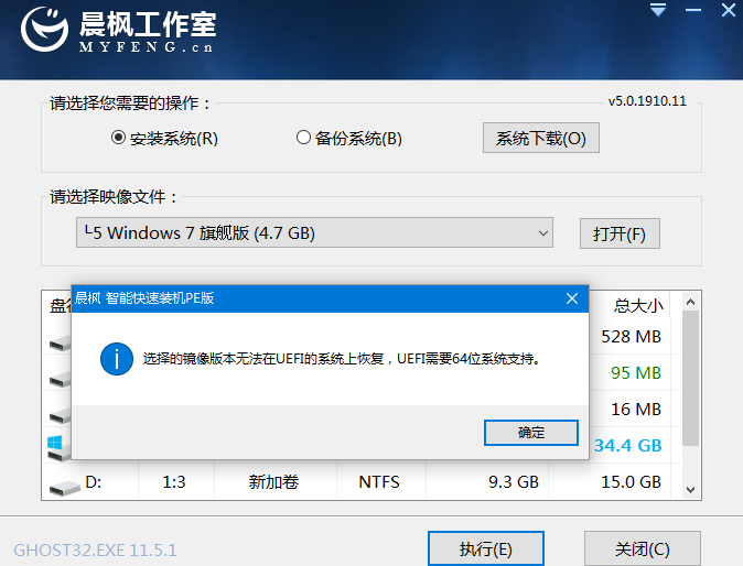 PS:在选择win7 的镜像系统时要注意,win7 X86是不支持UEFI启动的,会出现如下图弹窗,所以要选择win7 X64系统。