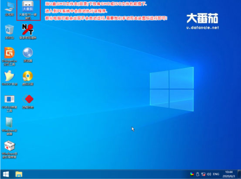 3、进入大番茄Win10PE维护系统后,找到“大番茄PE一键装机”,手动双击开始运行该软件,如下图:
