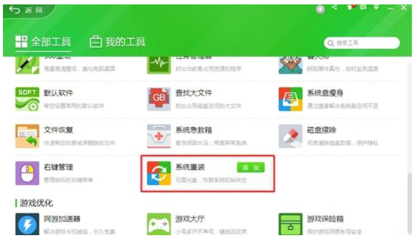 1、先在官网下载360安全卫士,接着打开360安全卫士,在所有工具中添加【系统重装】;