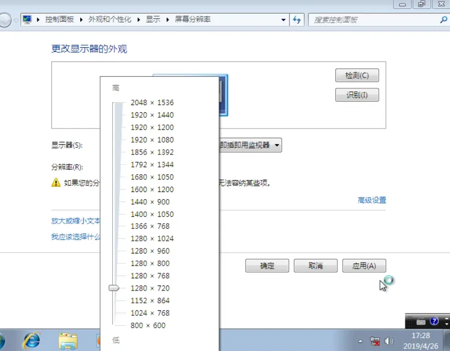 7、可以调自行调整屏幕分辨率,选择合适自己的分辨率,点击【应用】,再更新相关设置即可。