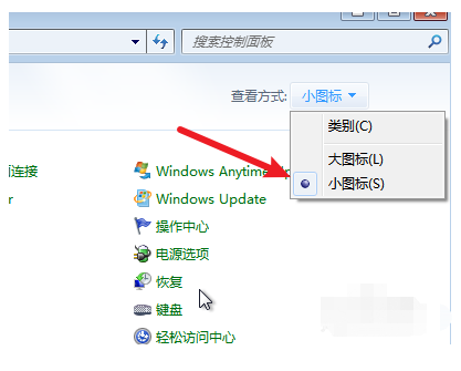 2、在控制面板页面,点击右上角的查看方式,将其设置为小图标。