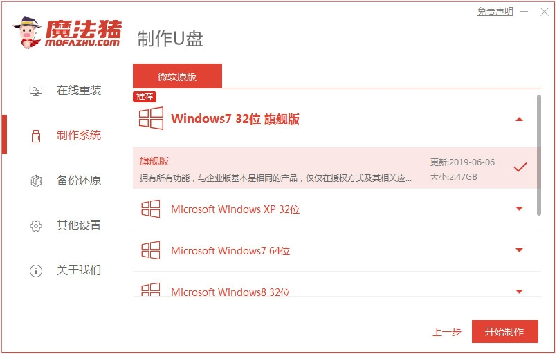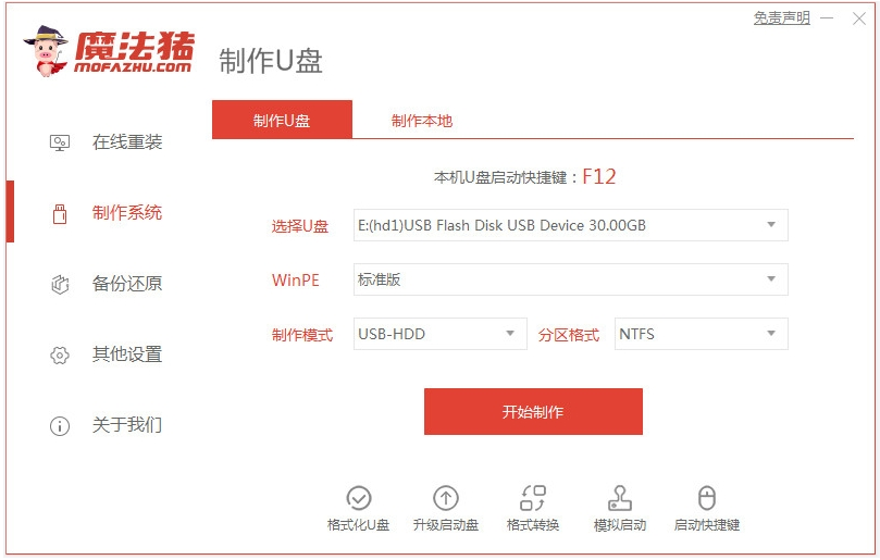 1、先在电脑安装魔法猪一键重装系统工具并打开,插入空白u盘,然后制作系统模式下点击开始制作。
