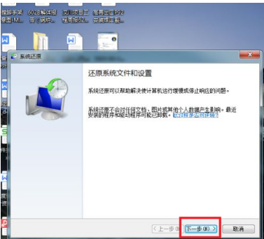 6、在打开的系统还原界面中,单击界面底部中间的“下一步”按钮。
