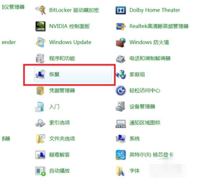 4、在控制面板界面中,找到“恢复”菜单项,进入系统恢复界面即可。