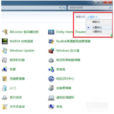 3、打开控制面板主界面之后,单击界面右上角“查看方式”设置项,切换为“大图标”显示界面。