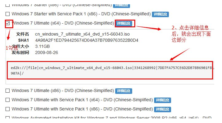 5、随后选择需要下载的系统版本,第一步勾选,第二步点击详细信息,点击详细信息后会出现一个种子。