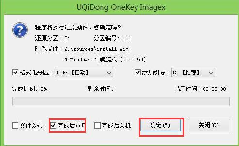 步骤3、弹出的确认提示窗口时,勾选“完成后重启”,再点击确定。