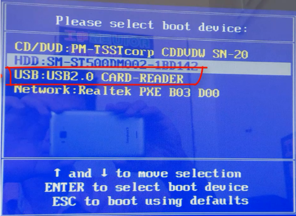 4、u盘插入需要重装的电脑usb接口上,并重启电脑快速断续的按启动热键进入快速启动页面,选择带USB开头的u盘启动项按回车键进入。