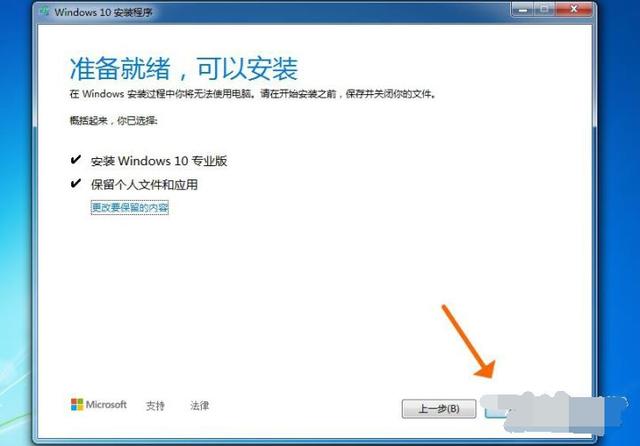 6、在“选择要保留的内容”处点选“保留个人文件和应用”,这样在Win7系统中的应用和文件数据在Win10安装完成后就都会完整保留下来了