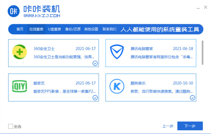 1、打开咔咔装机工具,选择系统,点击下一步;
