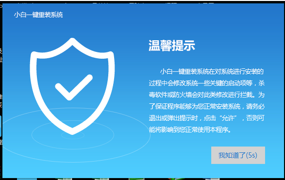 1、下载小白一键重装系统,打开后出现如图界面,根据提示关闭杀毒软件,点击我知道了