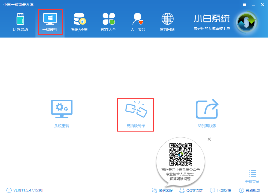 2,下载后并双击打开小白一键重装工具,进入默认的“一键装机”界面,点击“离线版制作”