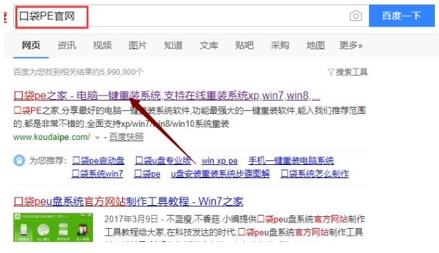 1、打开网页搜索引擎搜索“口袋PE官网”到官网内下载口袋PE软件。