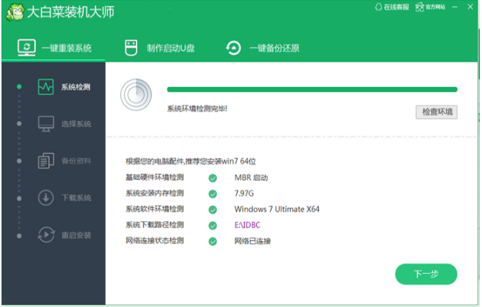 1、首先搜索并下载安装大白菜装机大师软件,然后打开在系统检测的选项中就可以看到“立即重装系统”的命令,然后点击。