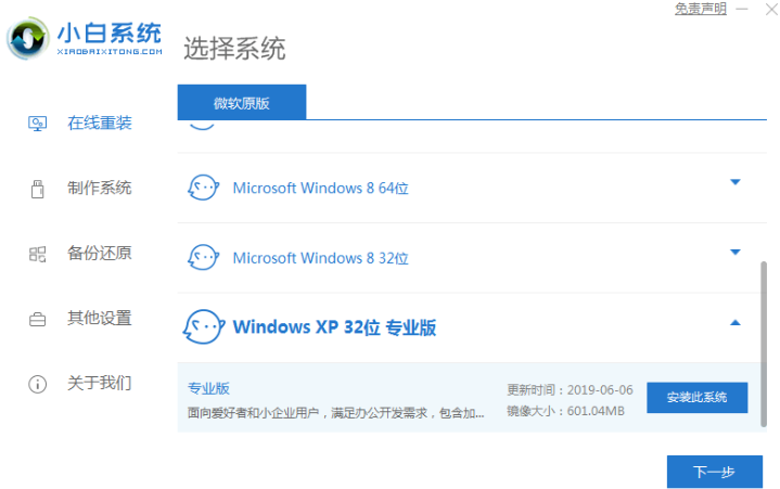 1、在电脑上下载安装小白一键重装系统工具并打开,选择需要安装的xp系统,点击安装此系统。(注意在安装前备份好c盘重要资料,关掉电脑上的杀毒软件避免被拦截)