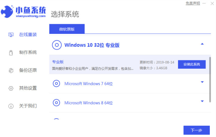 1.下载并安装鱼一键重装系统工具,打开电脑,关闭电脑杀毒软件,备份C盘重要信息。然后选择需要安装的电脑系统点击安装此系统。