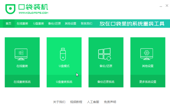 1.首先打开一台能上网的笔记本电脑,然后需要下载口袋装机软件,完成后再将其打开,选择U盘重装系统模式。
