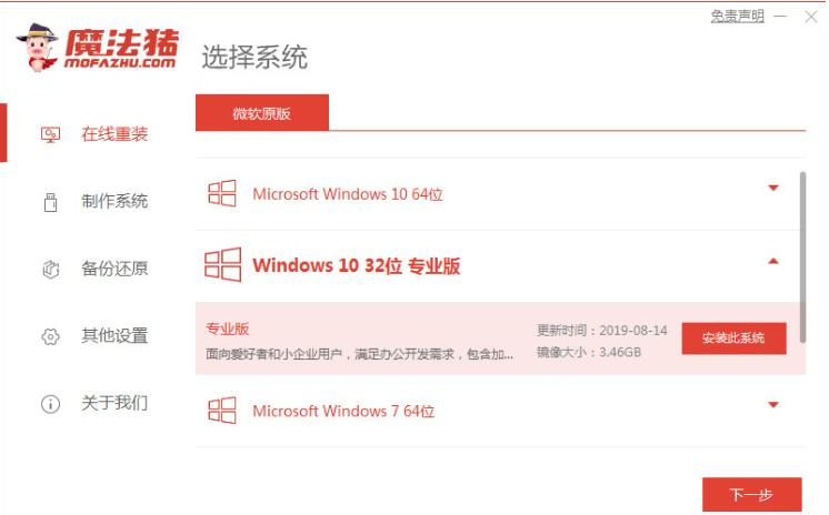 1.回到桌面后,我们打开桌面上一个叫魔法猪的重装系统软件,进入其首页当中,可以看见有很多的原版系统镜像,我们选择一个需要安装的系统,单击安装即可。