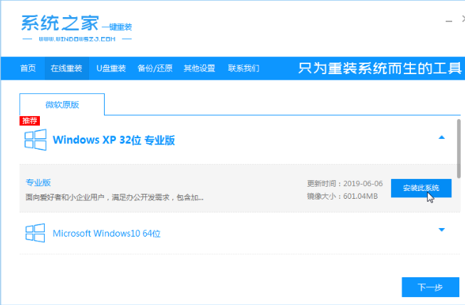 1、下载安装系统之家一键重装系统软件,选择xp系统点击安装此系统。(ps:安装前关闭电脑的杀毒软件打开,备份好重要资料)