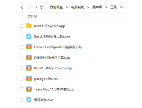 2、然后下载MacOS镜像、TransmacU盘制作软件、分区工具(DiskGenius)、EasyUEFI、EFI文件、Clover Configurator(四叶草助手,用来配置config)。