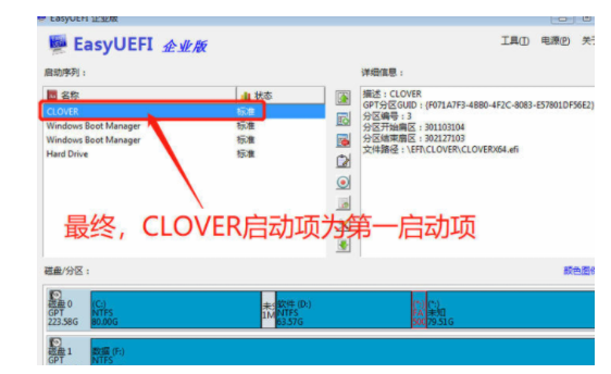 3)完成后打开分区工具,找到U盘(如果检测不到重新插拔一下U盘,可能会提示格式化U盘,不要管他),打开U盘上的EFI分区(引导分区),删除EFI文件夹,将适合自己电脑EFI文件夹使用快捷键粘贴进去,然后拷贝CLOVER驱动文件。路径:EFI/EFI/