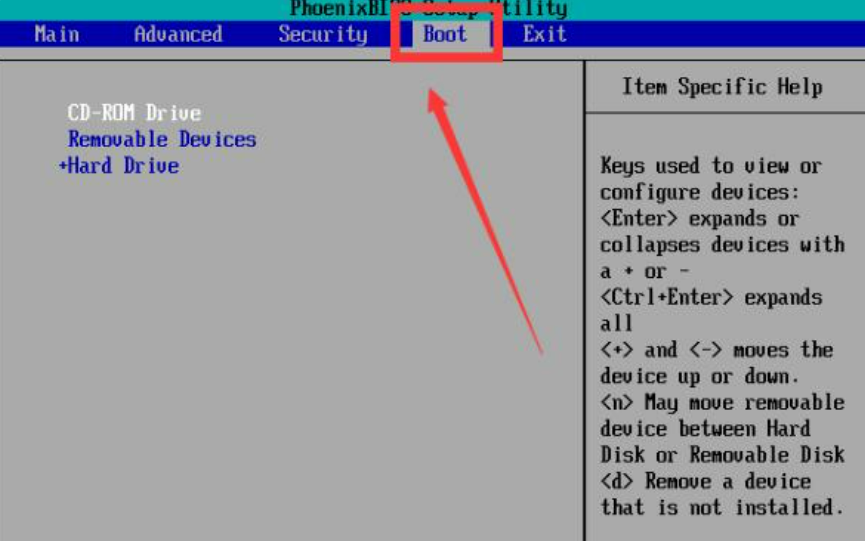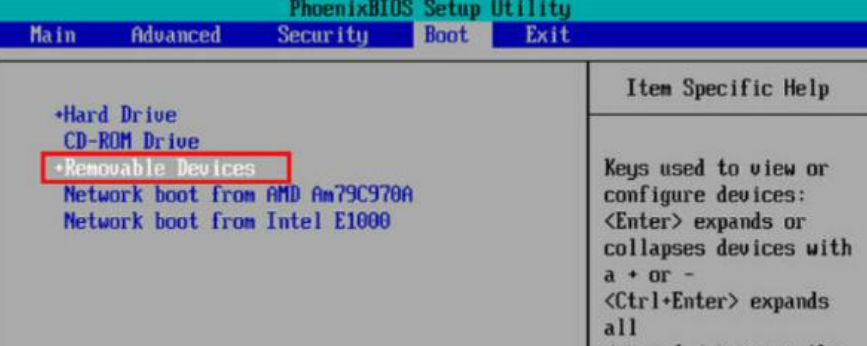 3、此时按住【+】键将选项向上移动到页面的第一个位置上,也就是把【removeble devic】移动到最上面,设置为第一启动项,然后按f10保存设置即可。