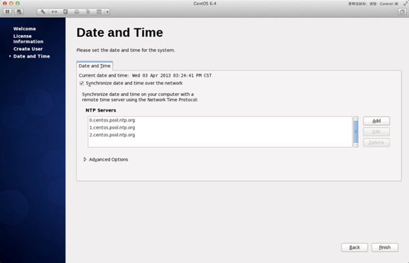 18、在“Date and Time”选项中选中“Synchronize data and time over the network”,点击“Finsh”。