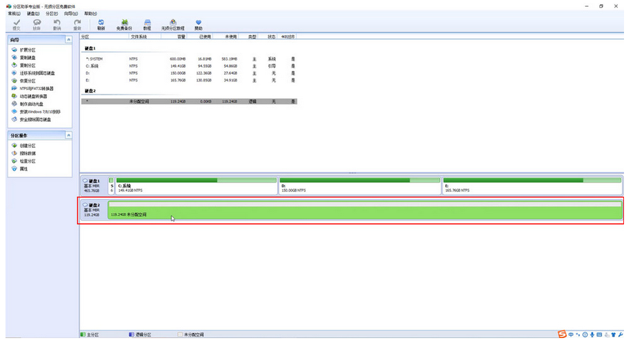 安装或接入新的的固态硬盘后,在我的电脑中并不会看到盘符,因为还未初始化,我们可以在磁盘管理中看到新硬盘,不需要进行任何操作。直接打开分区助手,就可以看到我们新安装的固态硬盘。