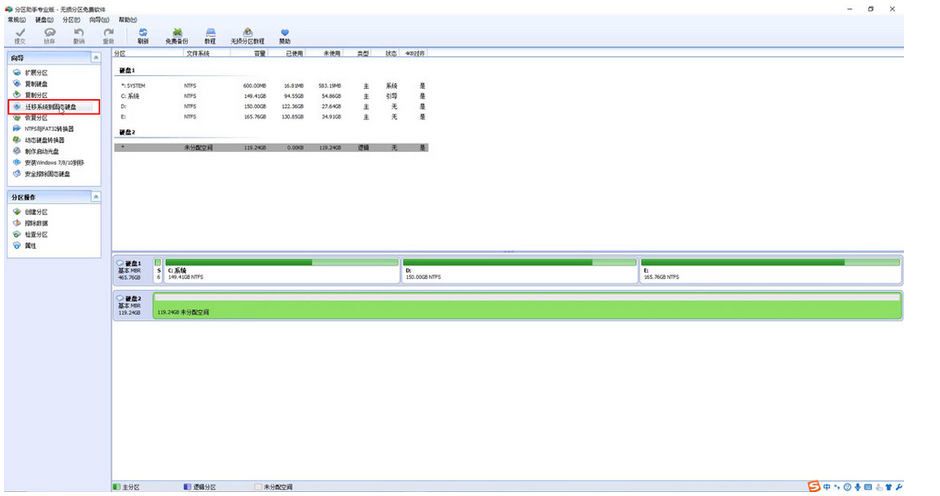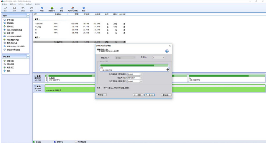 3、点击左侧向导中的迁移系统到固态硬盘,根据提示操作,选择迁移目标盘,也就是新安装的固态硬盘,点击下一步,调整分区大小,由于我们安装是128G的固态,所以直接使用全部空间作为系统盘,不再分区。