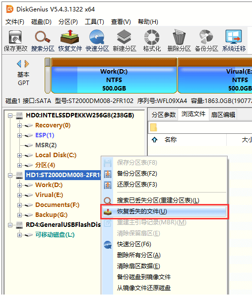 1、在软件左侧找到丢失数据的硬盘,右击该硬盘(例如HD0, HD1),选择"恢复丢失的文件"。