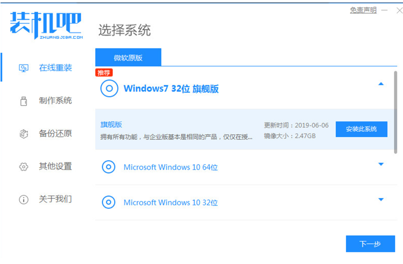1、首先下载安装装机吧工具软件,选择要安装的系统,点击下一步。