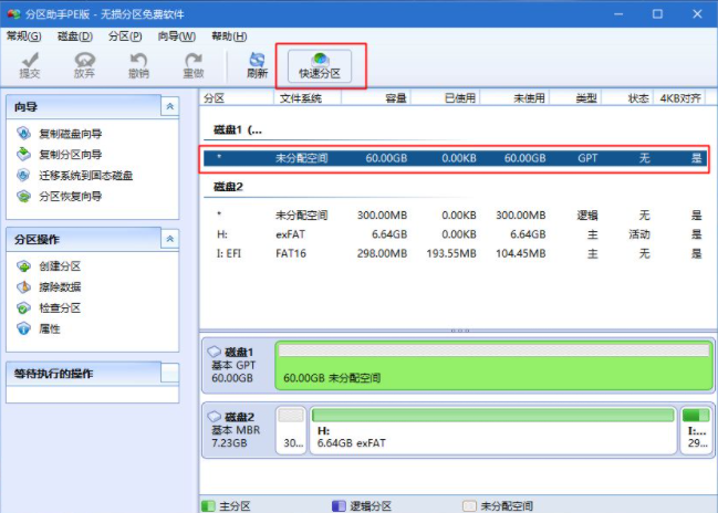 5、双击桌面上的【分区助手(无损)】,选择磁盘1,点击【快速分区】。