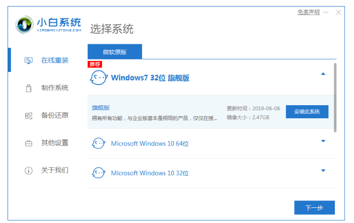 1、在自己的电脑上下载安装并运行打开小白一键重装系统,选择win7系统。