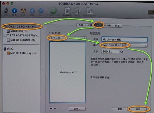 5、勾选要安装系统的硬盘,双击【分区】,分区布局选择【1个分区】,格式选择【Mac OS扩展(日志式)】,双击应用。