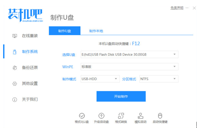 1、在惠普电脑上下载安装好装机吧一键重装系统工具并打开,插入U盘,选择制作系统,点击开始制作。