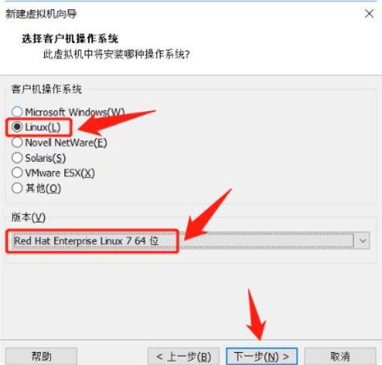 4.客户机操作系统选择Linux(L)Red Hat Enterprise Linux 7 64 位,点击下一步。