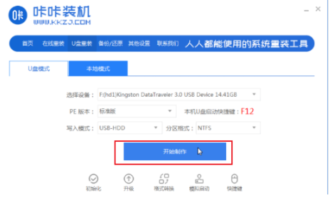 1.下载安装咔咔一键重装系统并打开,插入一个8g以上的空白u盘,点击u盘重装系统模式,点击开始制作。