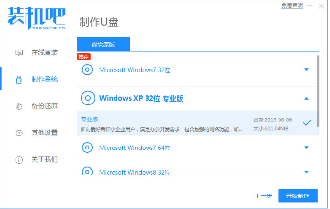 1、下载安装装机吧一键重装系统软件并打开。准备一个8GB以上的U盘。选择制作系统,在制作U盘中选择自己的U盘,其它参数默认点击开始制作。