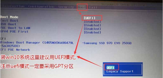 2、鼠标点击【boot】,找到【boot hode】,将其修改为【uefi】模式。