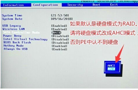 3、在【Configuration】当中,鼠标点击【SATA Controller Mode】修改为【ahci】模式即可。