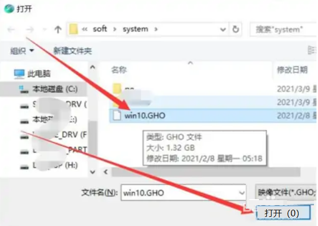 3、在“打开”弹框当中,选中【win10.GHO】,单击【打开】。