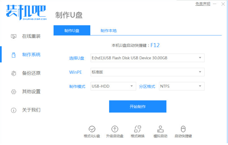 1、下载装机吧一键重装系统,准备一个U盘,选择制作系统,点击开始制作。