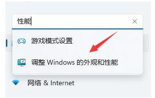 2、在左上角搜索框中搜索“性能”进入“调整Windows的外观和性能”。