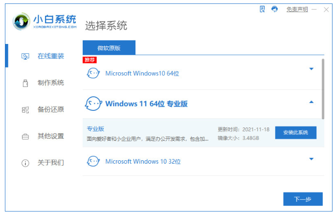 2、选择微软原版系统中的‘windows11 64位 专业版’后,点击‘安装此系统’。